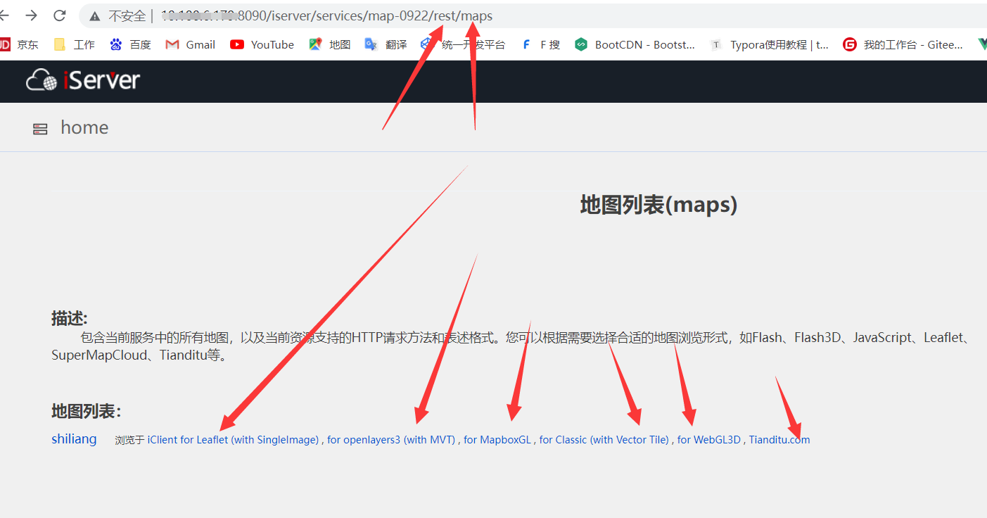 您好,需要在地图列表里点开需要调用的地图,然后复制打开的地图页面的网址,maps后面得带上地图的名字,例如:http://localhost:8090/iserver/services/test/rest/maps/ndvi_dem%40China