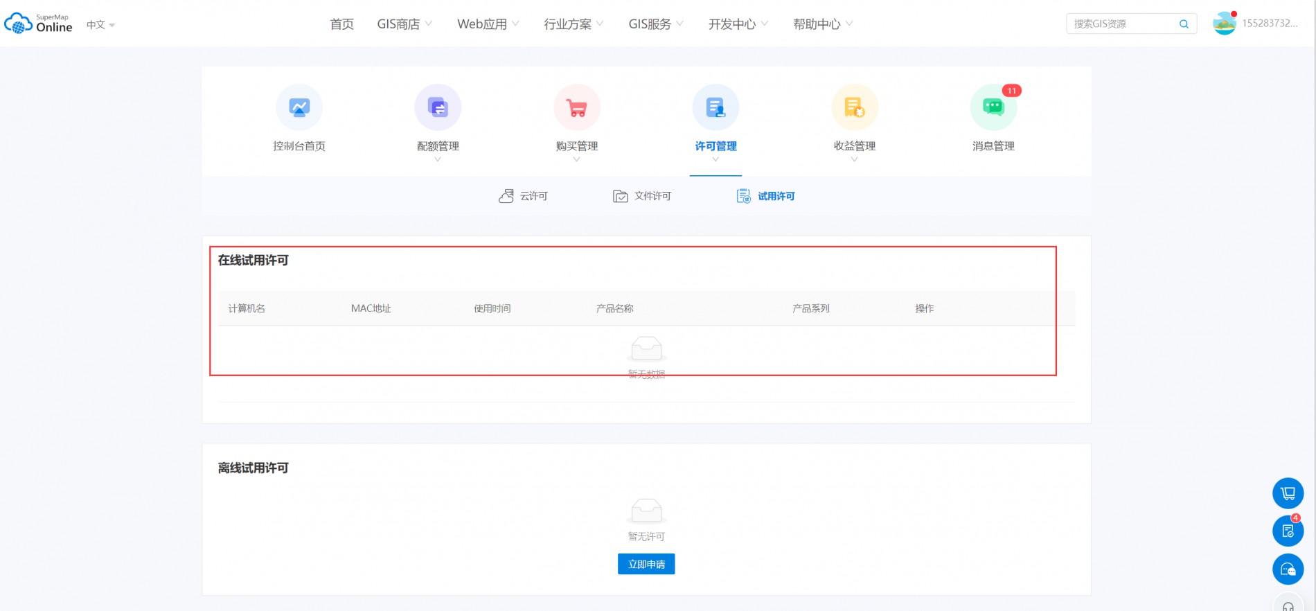 已注册supermap online账号,没有获得在线试用许可权限。