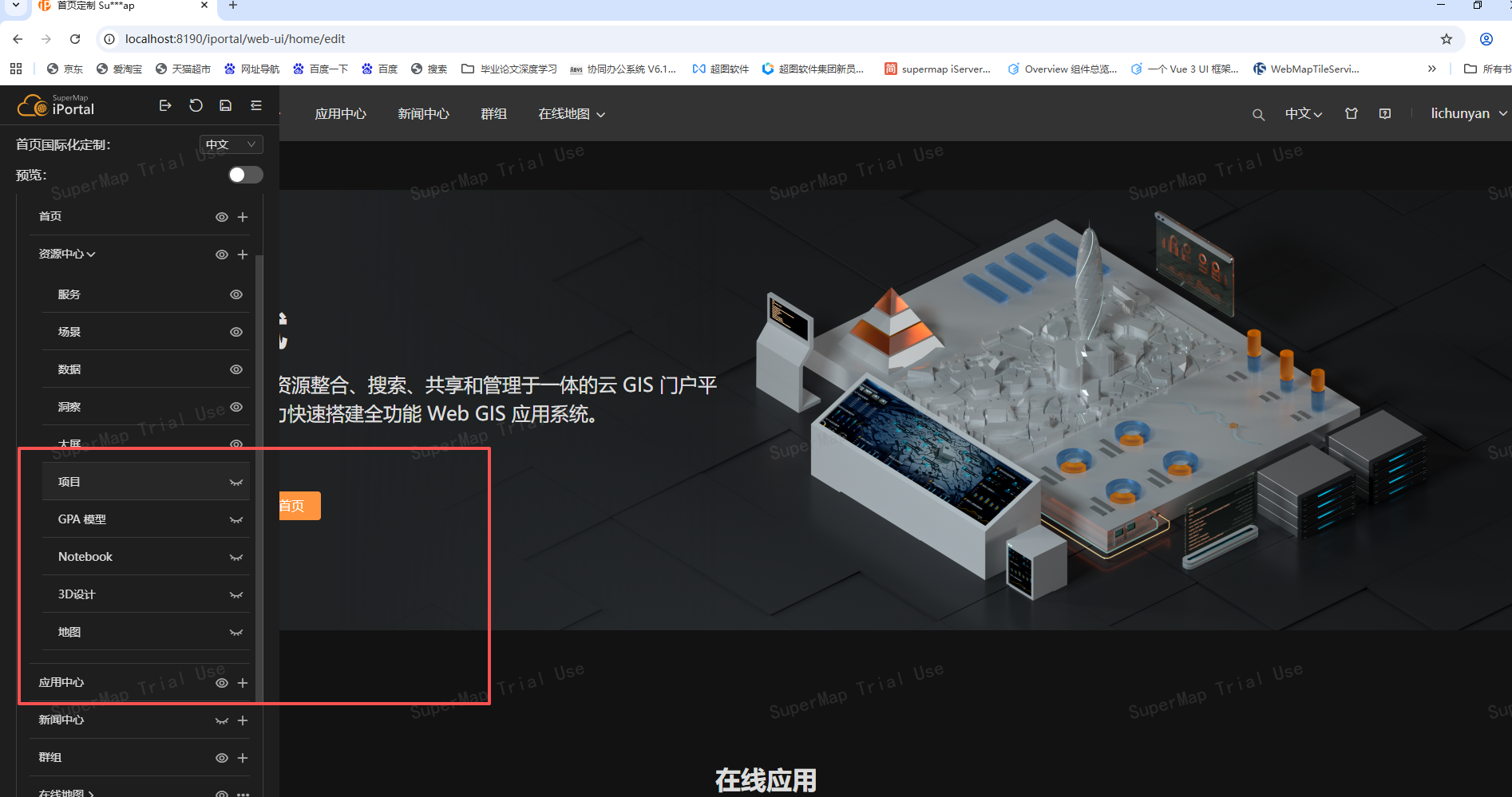 超图FAQ:在iPortal 11.3.0中,管理员已将某些模块在导航栏中设置为隐藏,但退出登录再重新以管理员身份登录后,首页仍然会显示这些隐藏的下拉选项。