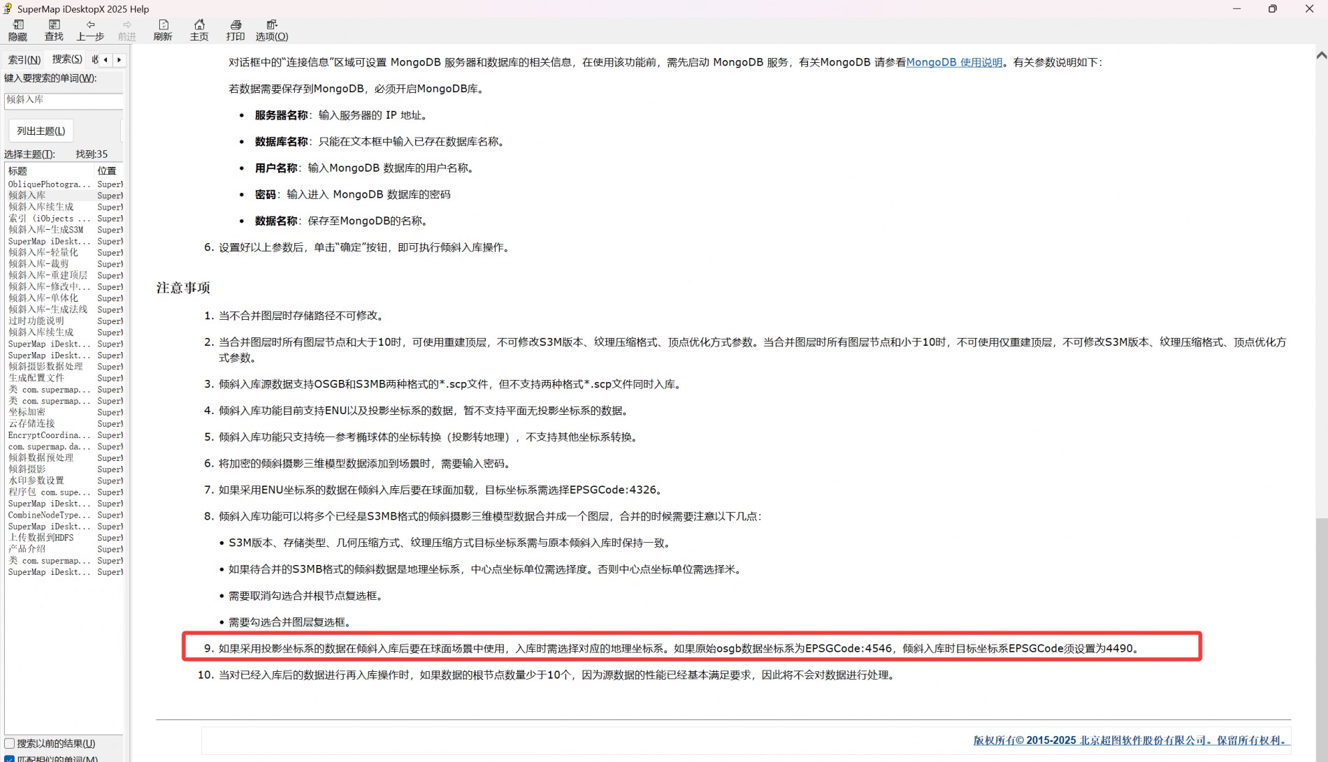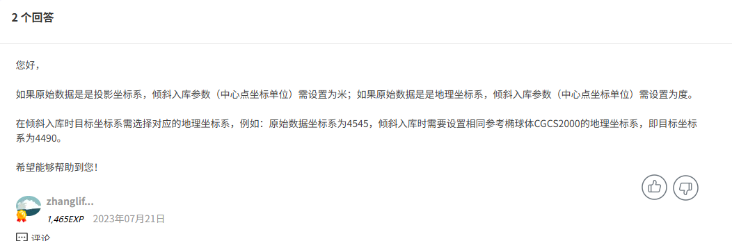 PS:在另一篇回答中看到在参数配置时原坐标系为投影坐标系,倾斜入库是要设置成对应的地理坐标系?