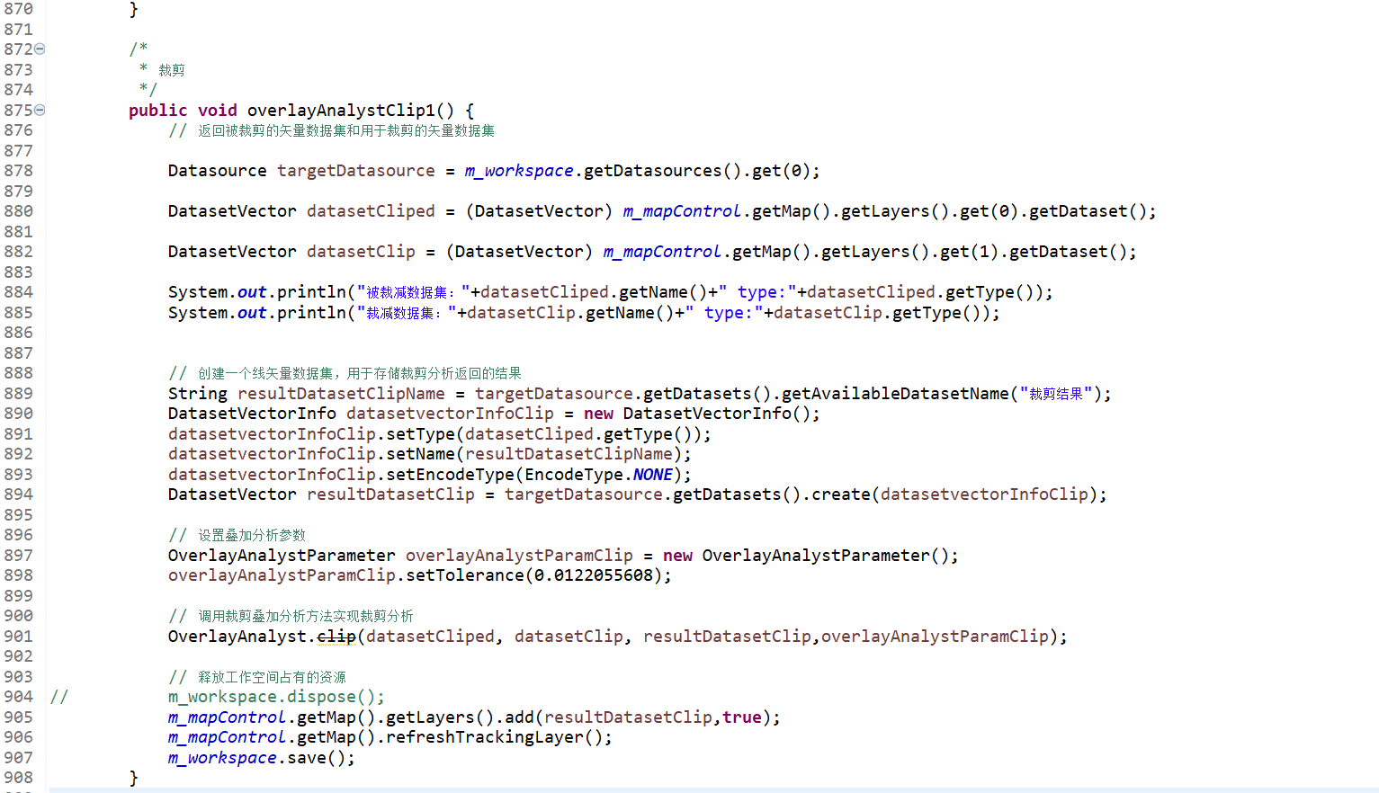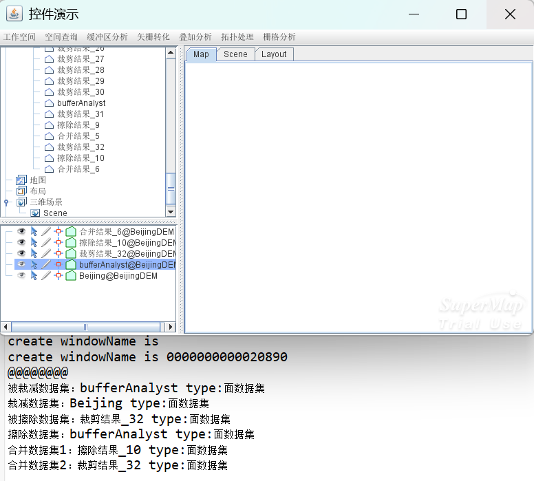 问题:运行官方帮助文档中的叠加分析示例代码,控制台显示运行完成,但结果窗口中切换到那几个图层总是一片空白,什么都没有
