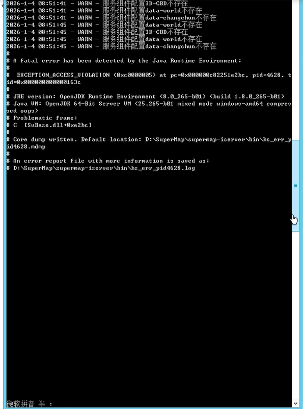 【解决办法】根据崩溃日志,是三维服务启动后报错,修改iserver-services.xml,找到有问题的三维服务,重新发布