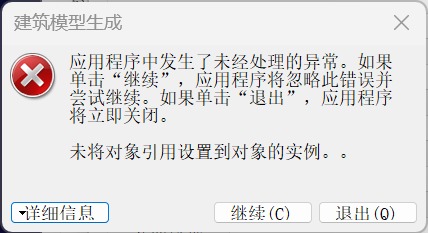 有关调用实时(JIT)调试而不是此对话框的详细信息, 请参见此消息的结尾。 ************** 异常文本 ************** System.NullReferenceException: 未将对象引用设置到对象的实例。 在 GetRandIndex(UGLOD2MaterialManager* pMaterialSet, Byte bPBR, Int32 nIndex) 在 SetMaterials(UGBuildingLod2Config* pConfig, UGLOD2MaterialManager* pMaterialSet, UGBuildingTextureSetLOD2* textureSet, Byte bPBR) 在 SuperMap.Realspace.ThreeDDesigner.ProceduralBuildingTools.GetOrRandomLOD2BuildingConfig(OgdcUnicodeString* strBlock, Double dHeight, vector<UGC::BUILDING::UGLOD2MaterialManager \*\,std::allocator<UGC::BUILDING::UGLOD2MaterialManager \*> >* lod2Manages, map<OGDC::OgdcUnicodeString\,UGC::BUILDING::UGLOD2BuildingSetting\,std::less<OGDC::OgdcUnicodeString>\,std::allocator<std::pair<OGDC::OgdcUnicodeString const \,UGC::BUILDING::UGLOD2BuildingSetting> > >* mapLOD2BuildingBlockSettings, UGBuildingTextureSetLOD2** pTextureSet, UGBuildingLod2Config* config, map<OGDC::OgdcUnicodeString\,enum UGC::BUILDING::BuildingType\,std::less<OGDC::OgdcUnicodeString>\,std::allocator<std::pair<OGDC::OgdcUnicodeString const \,enum UGC::BUILDING::BuildingType> > >* mapBlockClassify, Byte bPBR) 在 SuperMap.Realspace.ThreeDDesigner.ProceduralBuildingTools.GenerateBuildings(DatasetVector dataset, ProceduralBuildingParameter proceduralParameter, Datasource datasourceDes, String strDatasetName) 在 BuilingFramework.FormParameter_new.M_buttonOK_Click(Object sender, EventArgs e) 在 System.Windows.Forms.Control.OnClick(EventArgs e) 在 System.Windows.Forms.Button.OnMouseUp(MouseEventArgs mevent) 在 System.Windows.Forms.Control.WmMouseUp(Message& m, MouseButtons button, Int32 clicks) 在 System.Windows.Forms.Control.WndProc(Message& m) 在 System.Windows.Forms.ButtonBase.WndProc(Message& m) 在 System.Windows.Forms.Button.WndProc(Message& m) 在 System.Windows.Forms.NativeWindow.Callback(IntPtr hWnd, Int32 msg, IntPtr wparam, IntPtr lparam)