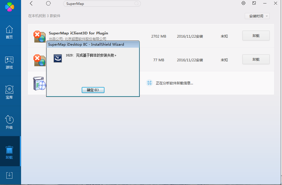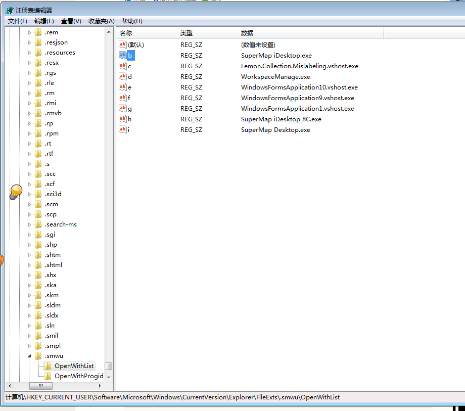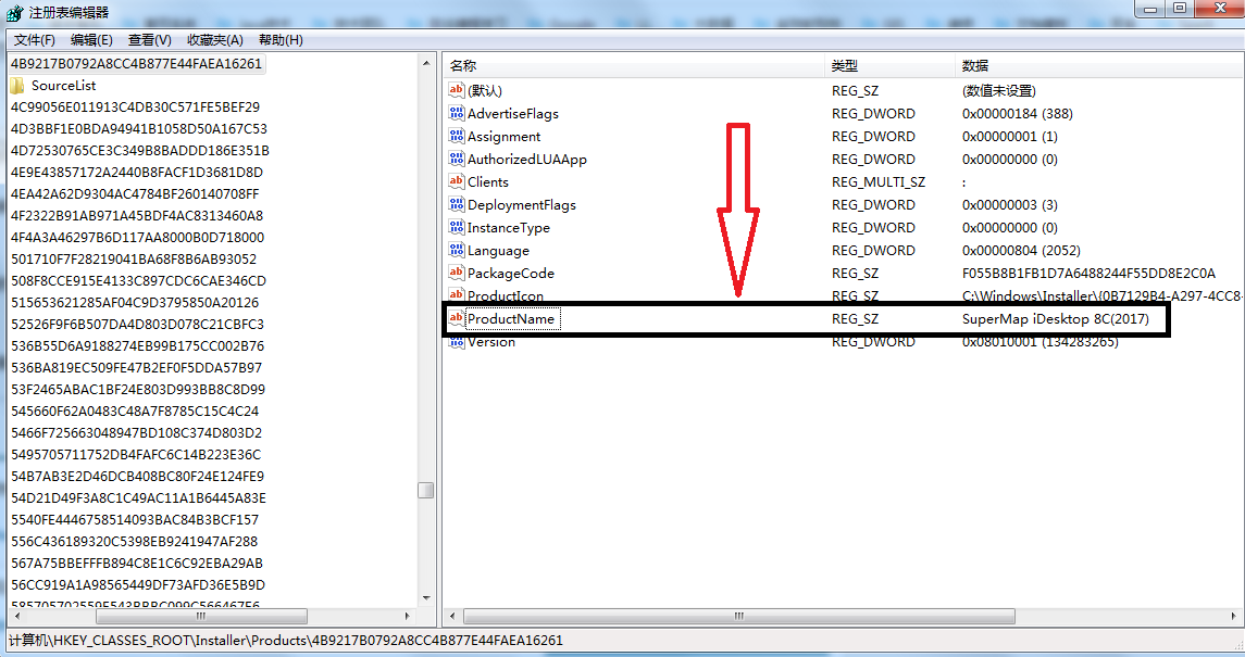 1 在单击操作系统的开始按钮,输入“regedit”命令运行注册表编辑器。 2 在 HKEY_CLASSES_ROOT 文件夹下,找到 Installer 子文件夹。 3 选中 Installer 文件夹,单击右键,在弹出的右键菜单中选择“查找”命令,查找“ SuperMap iDesktop 8C”。(查找的时候取消勾选“全字匹配”) 4 定位到搜索项后,在右侧区域删除“ProductName”的值,重新执行