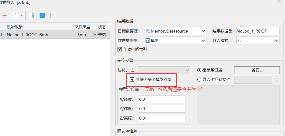 - 模型文件导入到模型数据集,如何分解为多个模型对象,而不是合并为1个要素?(导入时勾选【分解为多个模型对象】无效)