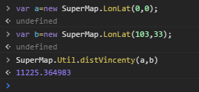 SuperMap.Util.distVincenty = function( p1, p2 )给出两个带有地理坐标的点对象,计算这些点在椭球表面上的距离。这个函数怎么用,我这样写得不到距离的值啊? var distanceA = new SuperMap.Util.distVincenty(new SuperMap.lonlat(ppoint.x, ppoint.y), new SuperMap.lonlat(origin.x, origin.y)); 类参考已经看了,还是没太弄明白,有类似的小例子吗?谢谢~