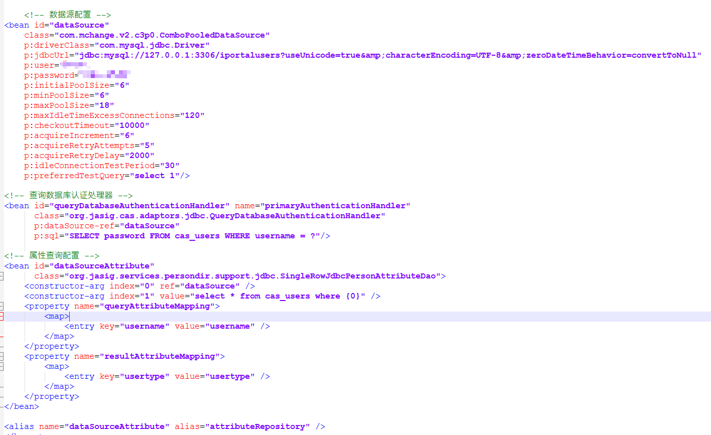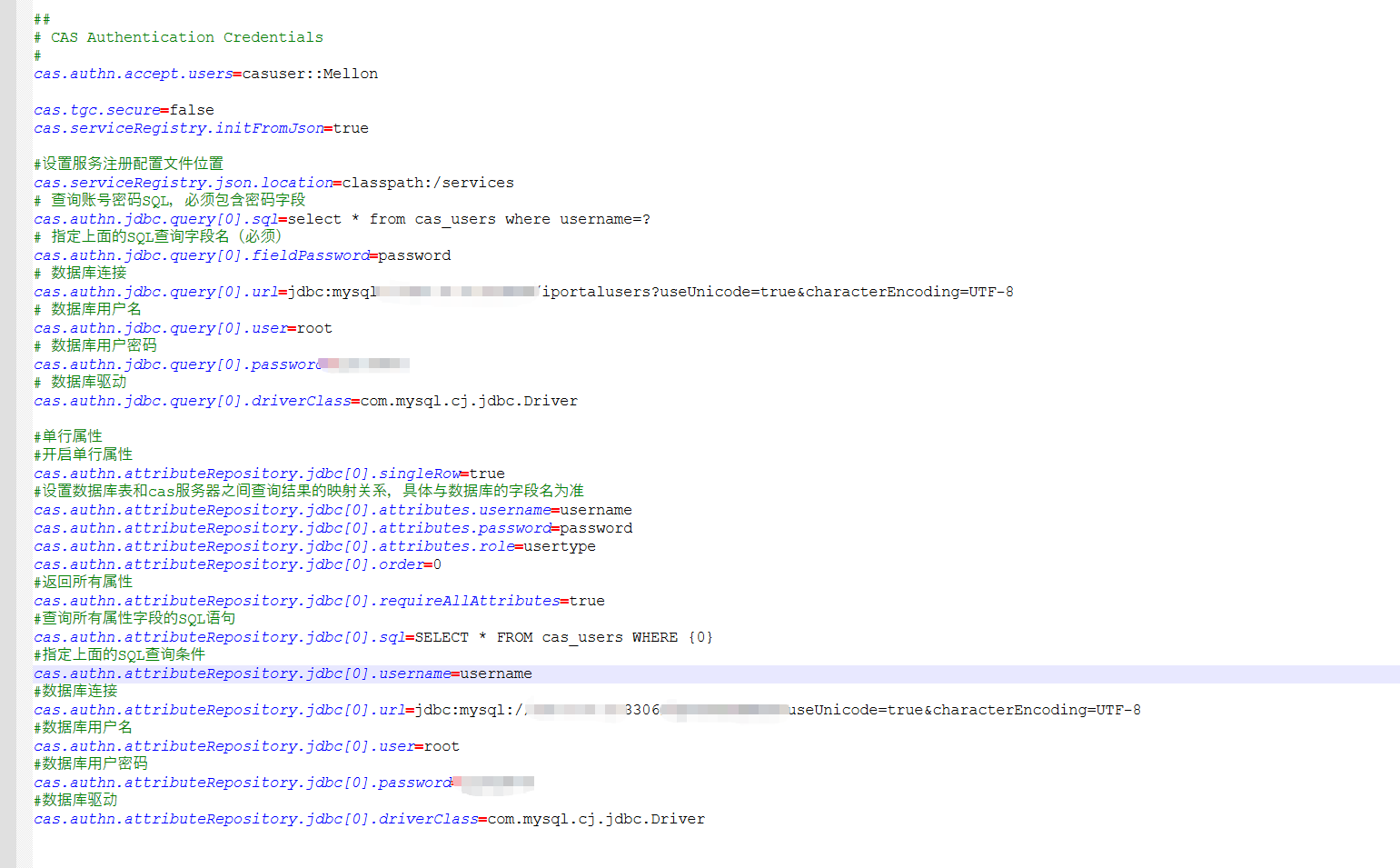 ①CAS 端:正确配置了从数据库查询并返回用户角色属性的设置。在 CAS 的 application.properties 文件中,必须包含类似下方的配置,以确保角色信息能正确返回给 iServer :