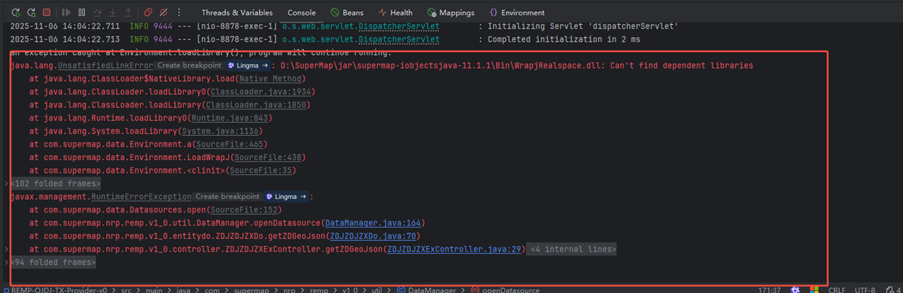 在进行iObjects Java组件开发,打开数据源时程序报错。