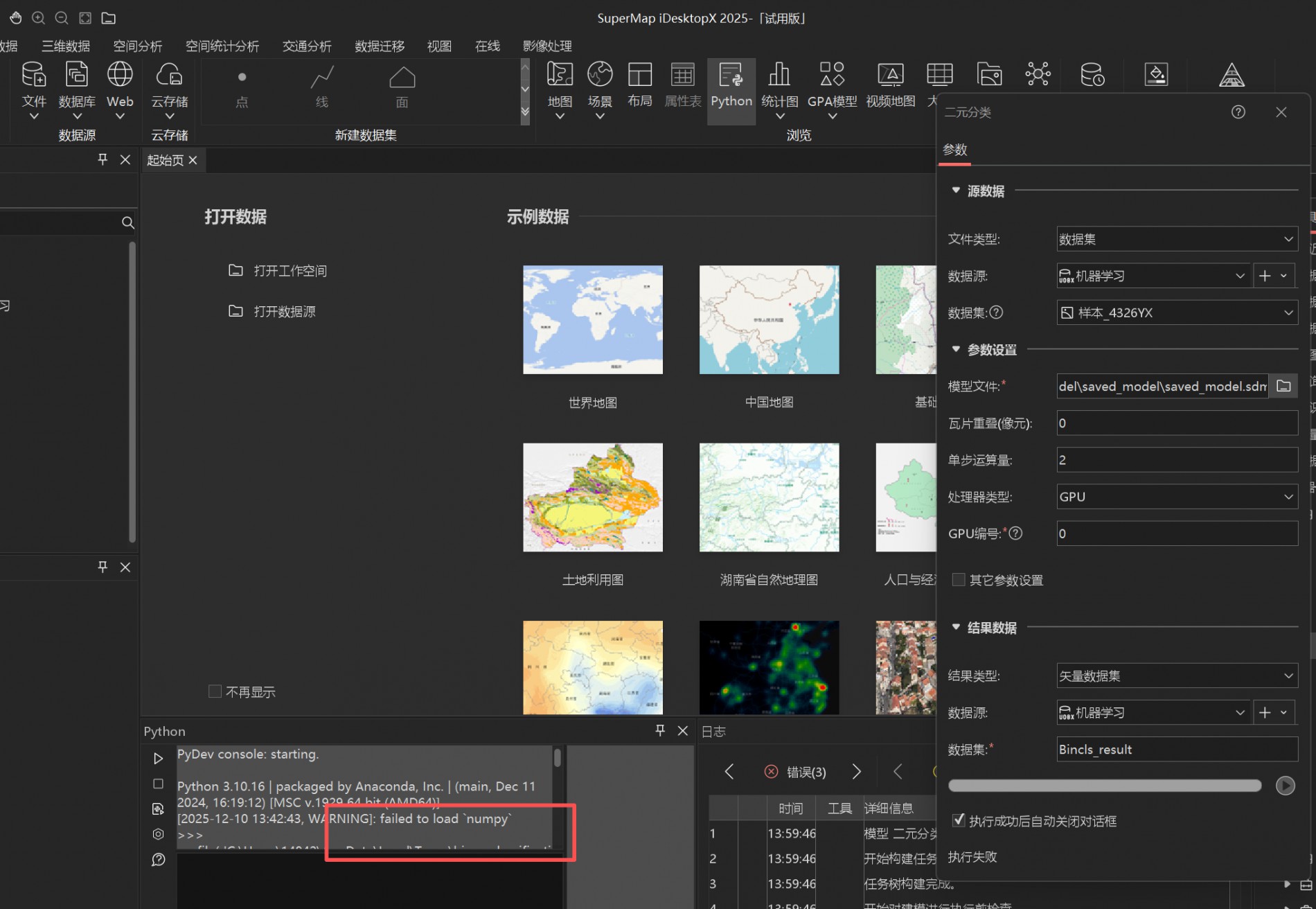 超图FAQ:iDesktopX 12.0.1使用ext ai3d-2025 u1扩展包,配置Python后提示加载numpy失败,导致机器学习算子无法运行。