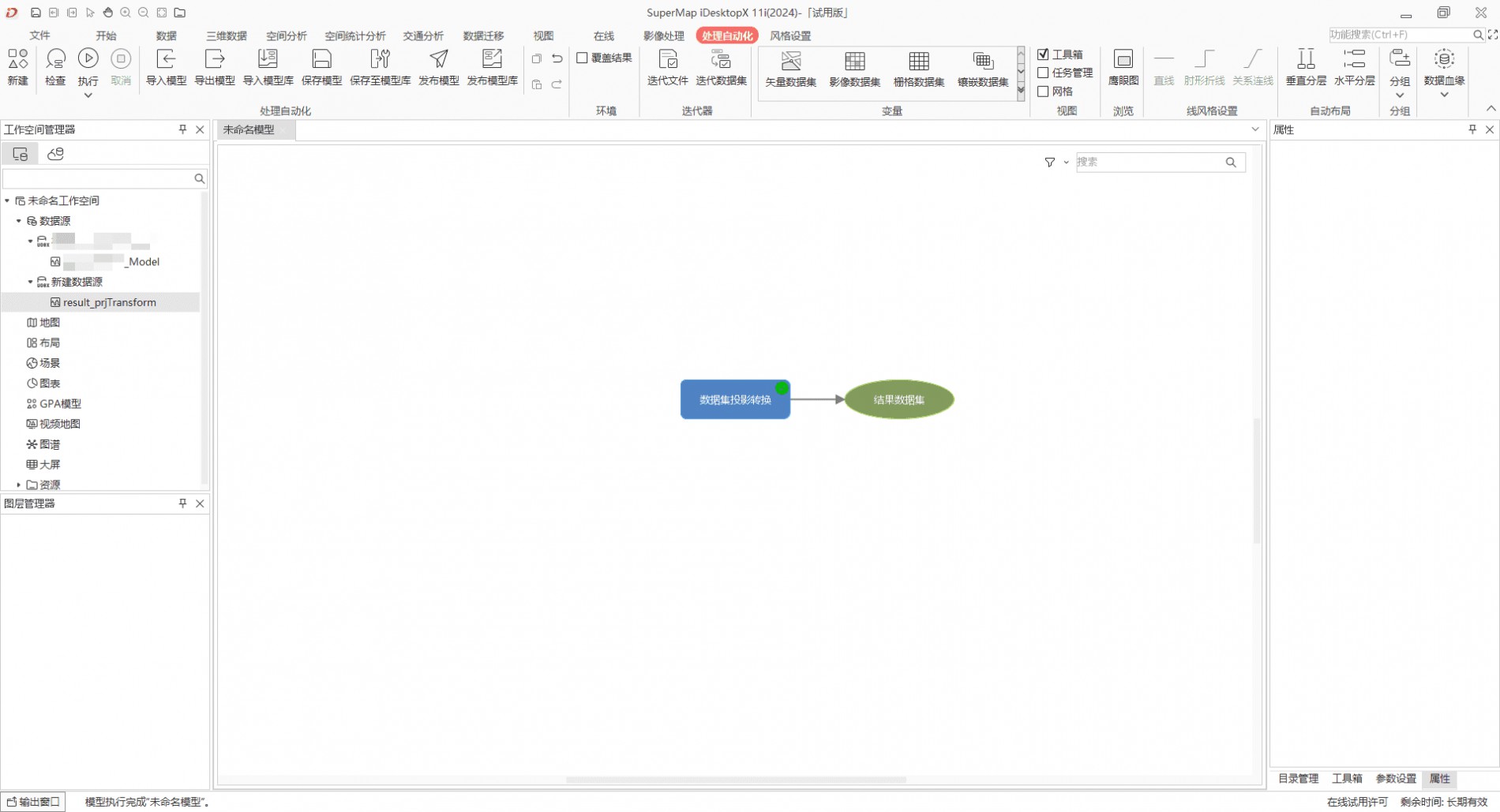 想要执行的数据处理操作,在iDesktop中使用独立的工具是没有问题的,但是将数据处理流程整理为GPA后,虽然显示GPA模型执行成功(速度很快),但输出结果是错误的,像是一个空文件。如图,选取流程中的数据集投影转换步骤进行测试,也无法得到想要的结果。