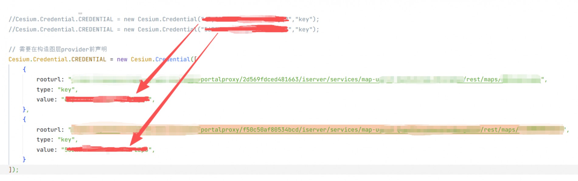 cesium开发加载iportal转发的二维地图服务,通过:Cesium.Credential.CREDENTIAL = new Cesium.Credential("","key");方式设置一个key,可以正常显示单图层服务。通过:Cesium.Credential.CREDENTIAL = new Cesium.Credential([{},{}]);方式设置多个key,图层加载失败。参考帖子地址:https://blog.csdn.net/supermapsupport/article/details/121210572。不知道问题在哪?