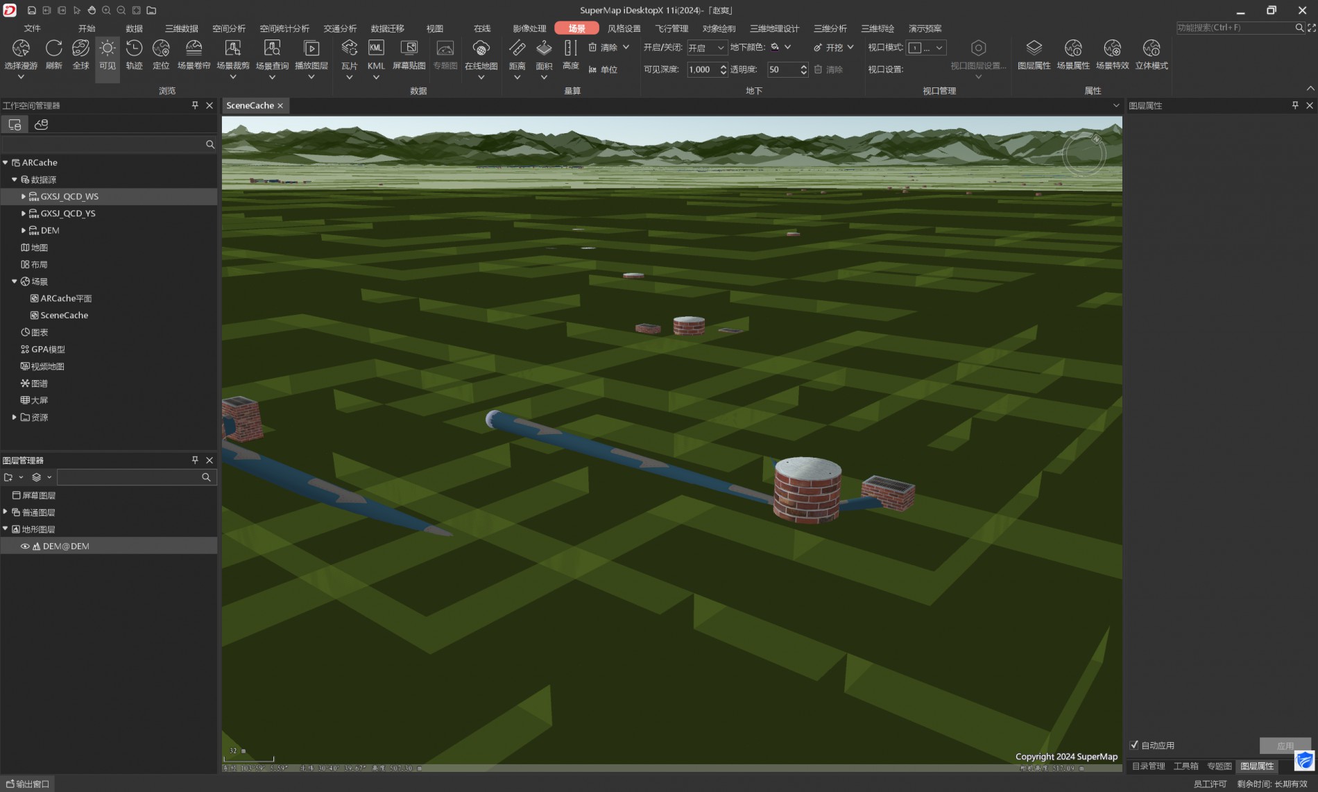 超图FAQ:在iDesktop三维场景中,如何设置地形的透明度,以使其能够显示地下的管线模型。已尝试设置透明度但未生效。